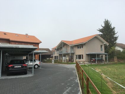 Autos können bei den gedeckten Carports und auf Aussenplätzen parkiert werden. Die Carports haben zusätzlich ein praktisches, hochgehängtes Aussenreduit.