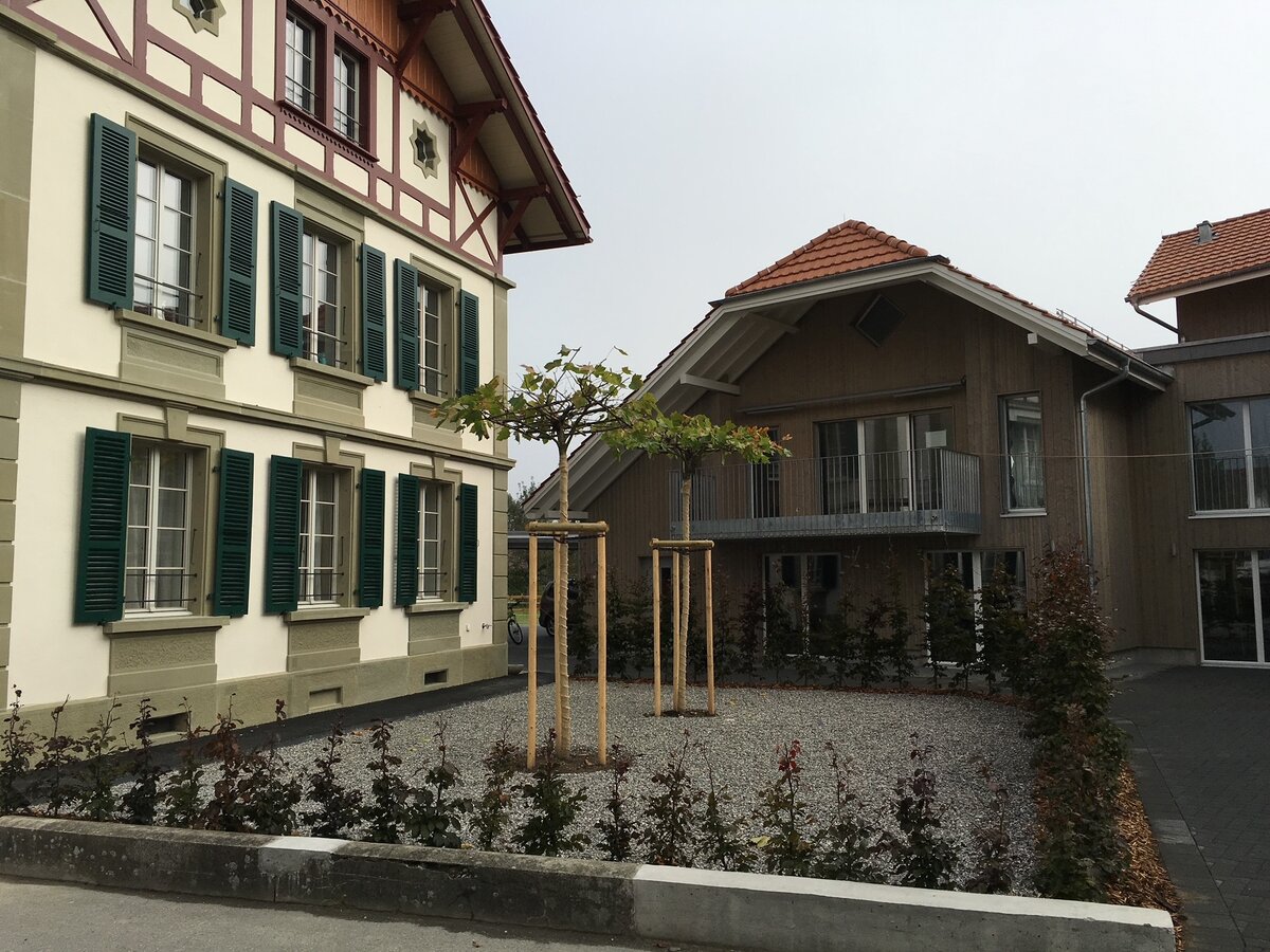 Das Bartlome Gut liegt südlich am Dorfkern, an äusserst ruhiger und ganztags besonnter Lage, direkt angrenzend an eine wunderschöne Wiese mit Obstbäumen und weidenden Pferden. Zum Bahnhof sind es lediglich 500 m und zum Einkaufen sogar nur 300 m. Es entsteht eine herrliche Oase an kinderfreundlicher und verkehrsarmer Lage mit direktem Blick ins Grüne. Sowohl Kindergarten wie Schulen aller Stufen (von der Primarschule bis zum Gynasium Hofwil) sind in Fussdistanz oder mit dem Fahrrad einfach erreichbar.